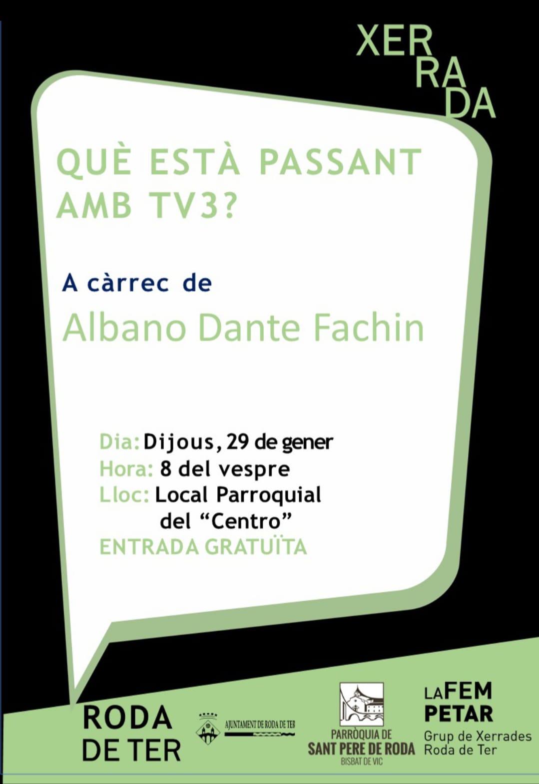 Xerrada organitzada per La Fem Petar a càrrec d’Albano Dante Fachin sobre la situació actual de TV3, els canvis recents en el model de la televisió pública i els debats que envolten el seu present i futur.