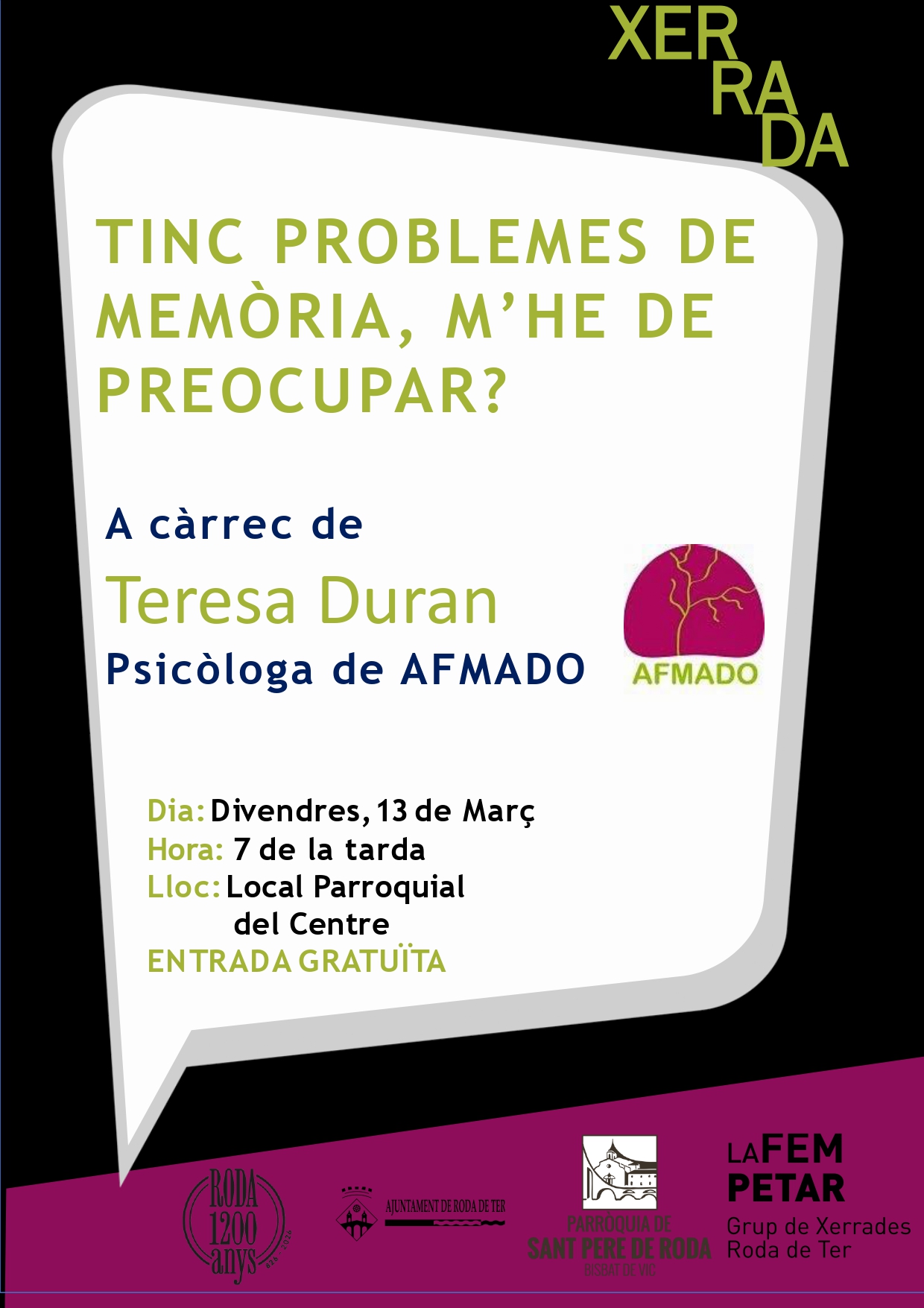 La sessió anirà a càrrec de Teresa Duran, psicòloga de l’associació AFMADO, que oferirà orientacions i informació per entendre millor els canvis de memòria associats a l’edat i quan cal posar-hi atenció.