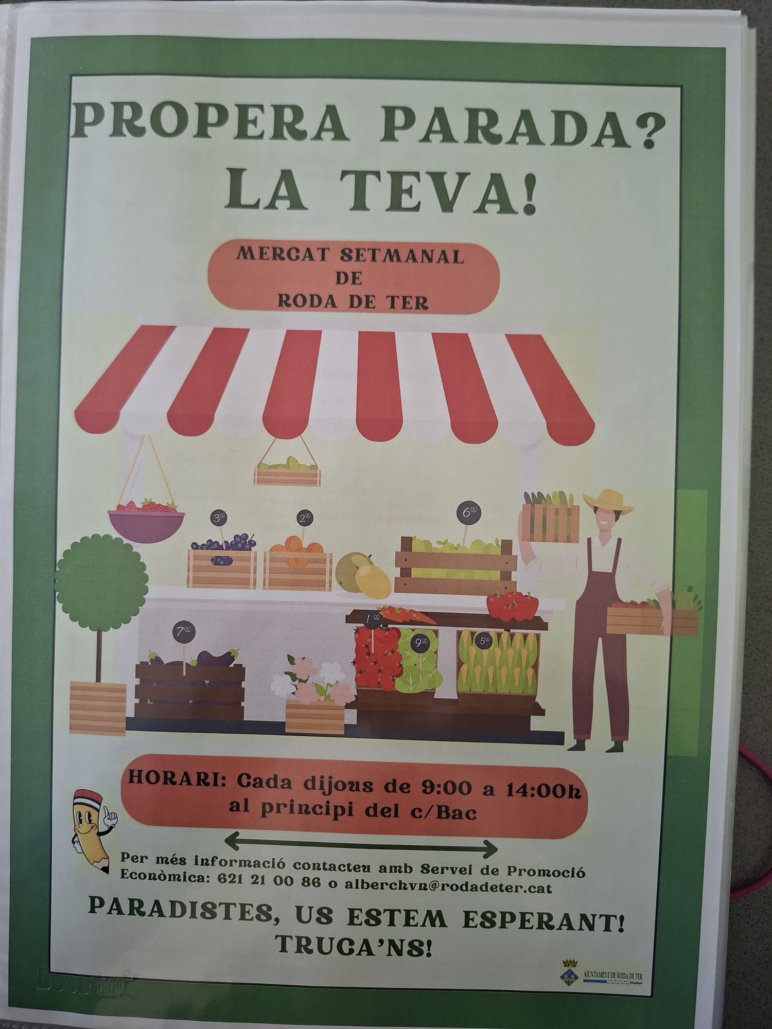 L’Ajuntament de Roda de Ter manté oberta la possibilitat que nous paradistes s’incorporin al mercat. Les persones interessades poden adreçar-se al consistori per rebre informació sobre les condicions de participació.
