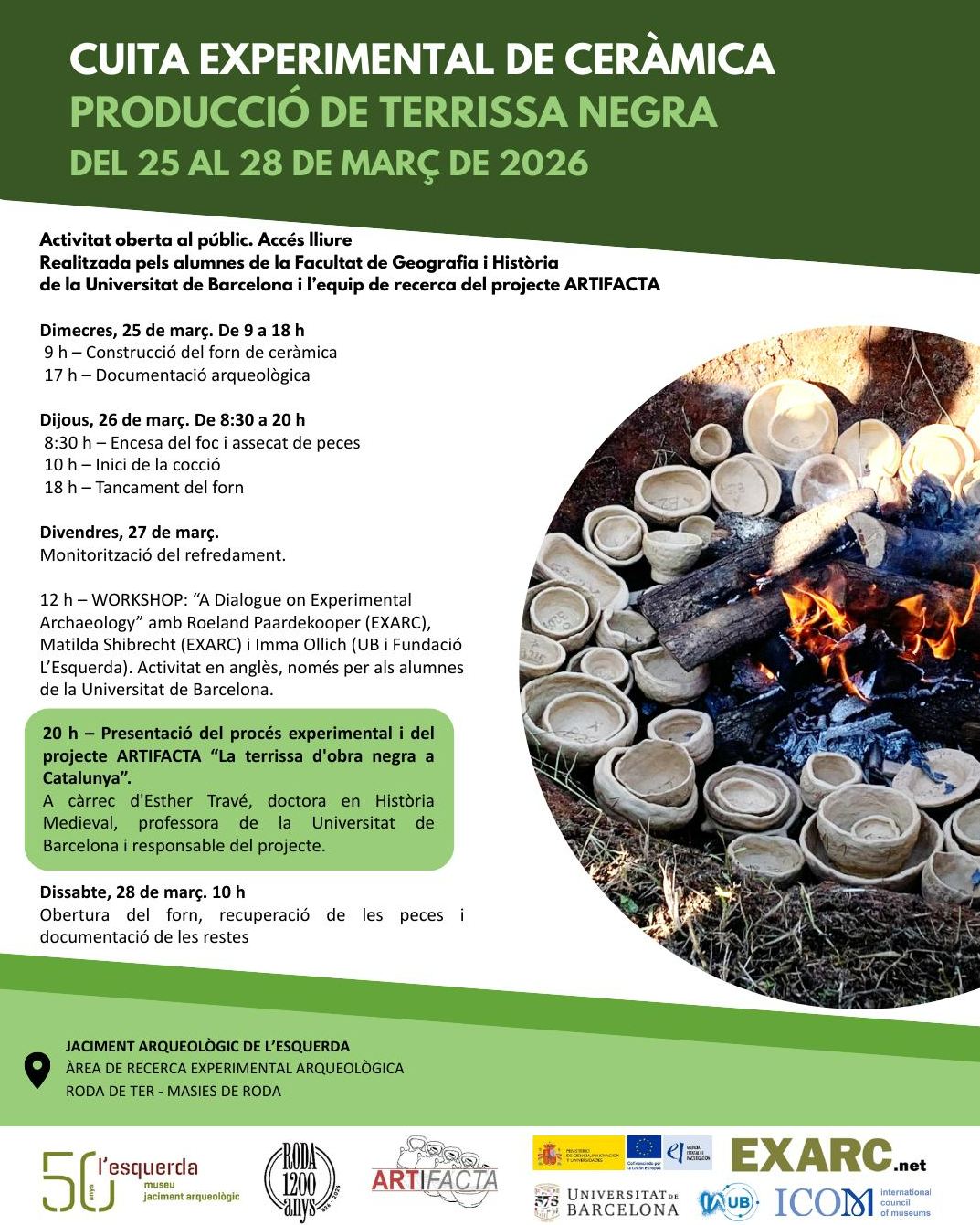 - 20.00 h – Presentació del procés experimental i del projecte ARTIFACTA: “La terrissa d’obra negra a Catalunya”, a càrrec d’Esther Travé (Universitat de Barcelona)